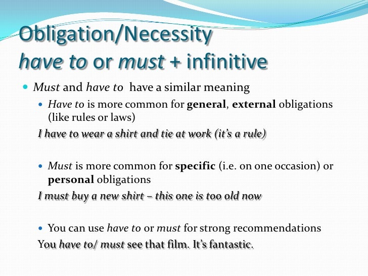 Nie może/ musi/ mógłby (can't have/ must have / might have. A short video explaining the difference between the modal verbs of obligation, "must" and "have to." Practice here:. Have to 'Have to' is used to express certainty, necessity, and obligation.