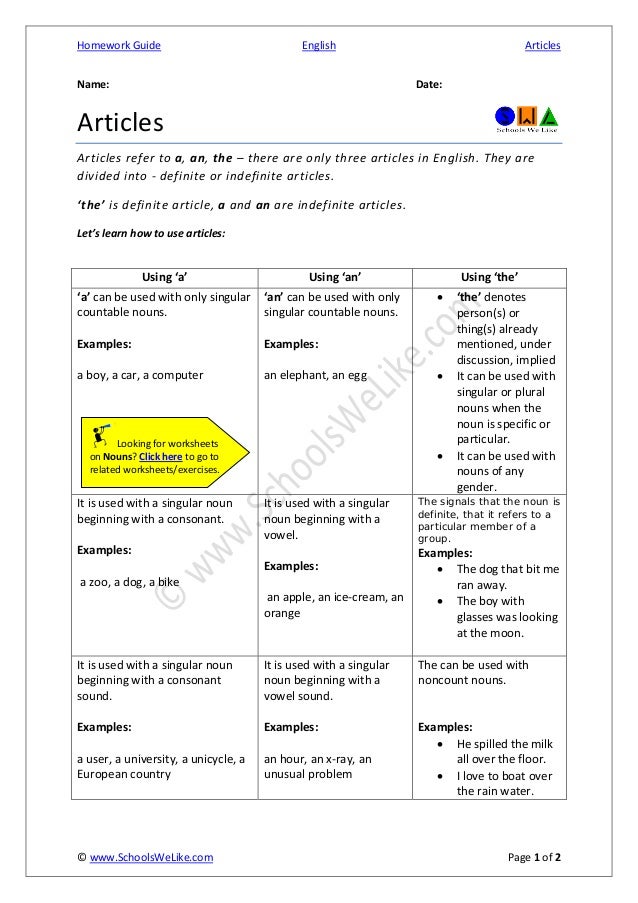 Articles Worksheet English Unite