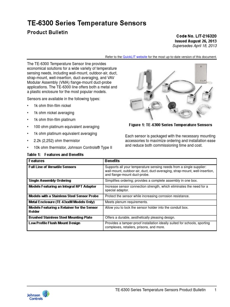 Johnson Controls TE-6300 Temperature Sensors provide economical solutions for a variety of temperature sensing needs, including:. Store Locations United States - Seattle. TE-631AM-2 TE-631AP-1 8 (3) TE-6312M-1 TE-6312P-1 Platinum (1k ohm) Adjustable 8 (3) TE-6351A-1 Duct 4 (102) TE-635GM-1 8 (3) TE-6351M-1 TE-6351P-1 18 (457) TE-635JM-1 Flange (VAV) 4 (102) TE-635GV-2 8 (3)TE-6351V-2 Flush N/A TE-6350F-0 TE-6350F-1 Outdoor air 3 (76) TE-6353P-1 Strap-mount 3 (76) TE-635S-1 Wall2 N/A TE-6324P-1 Well 6.